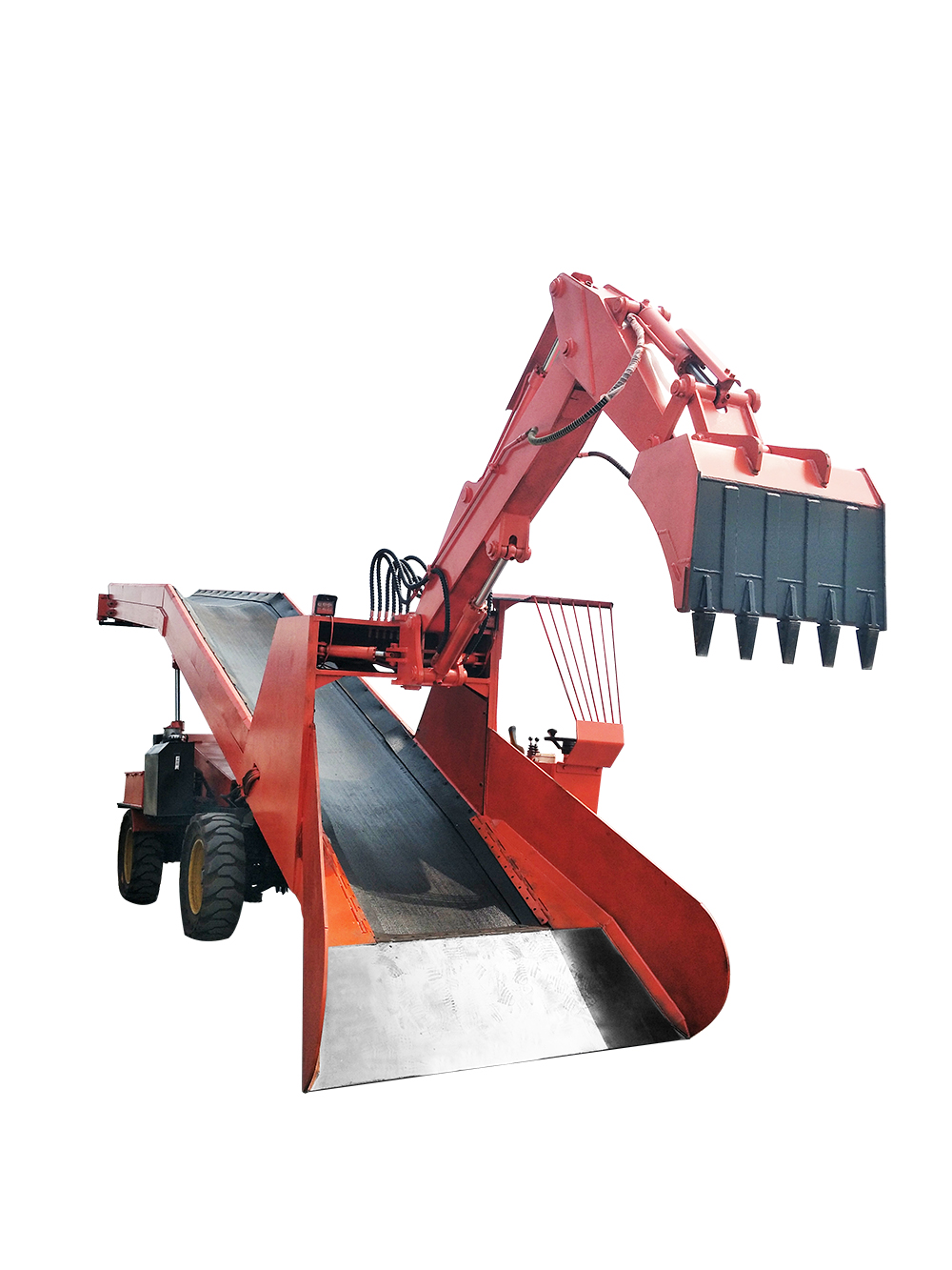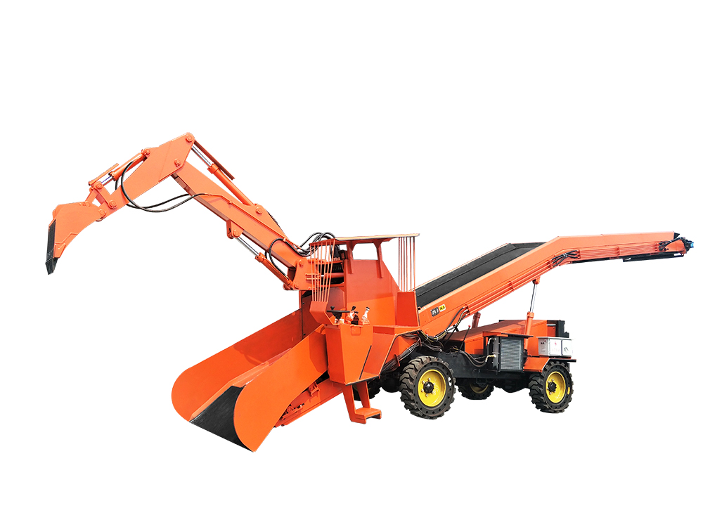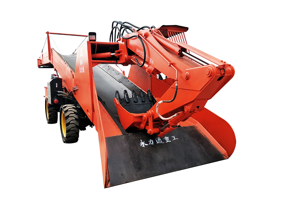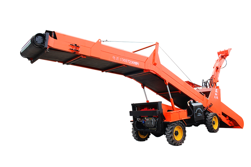 本机工作机构设计参考挖掘装载机形式,由工作机构扒取物料,并通过自身特制加高型皮带输送系统进行转载,从尾部卸入矿车或其它运矿设备中去。采用类似小松 PC80 挖掘机液压原理,采用全液压传动和系统负载传感控制及先导阀操作;液压油泵、软管总成、24 度锥接头、液压油滤芯均为原装进口;灵活的操作性是本机作业的核心,借助最佳的液压系统,均衡分配油量,令铲斗、小臂、大臂、动臂进行灵活、快捷、高效的作业,实现真正的随心所欲;强劲的挖掘力在任何条件下都能在短时间内发挥出色的工作效率及卓越的性能;工作平稳无冲压,设计先进,工作可靠,操作简单,维修方便。会开挖掘机的操作员和会维修挖掘机的钳工,均可对本机进行操作和对本设备进行维护与保养。用户无任何后顾之忧。