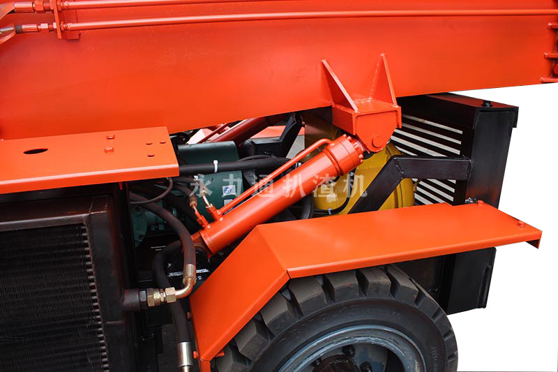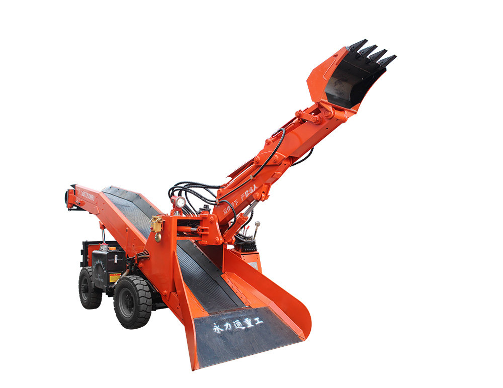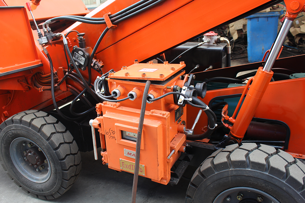 三、本机采用轮胎行走,前后桥同时驱动,结构紧凑,扒取范围广,可全断面扒料装车,不留死角,不需人工辅助清理工作面,减轻了工人的劳动强度。驾驶室操作台装有控制按钮和操作手柄,完全符合人机工程学;
