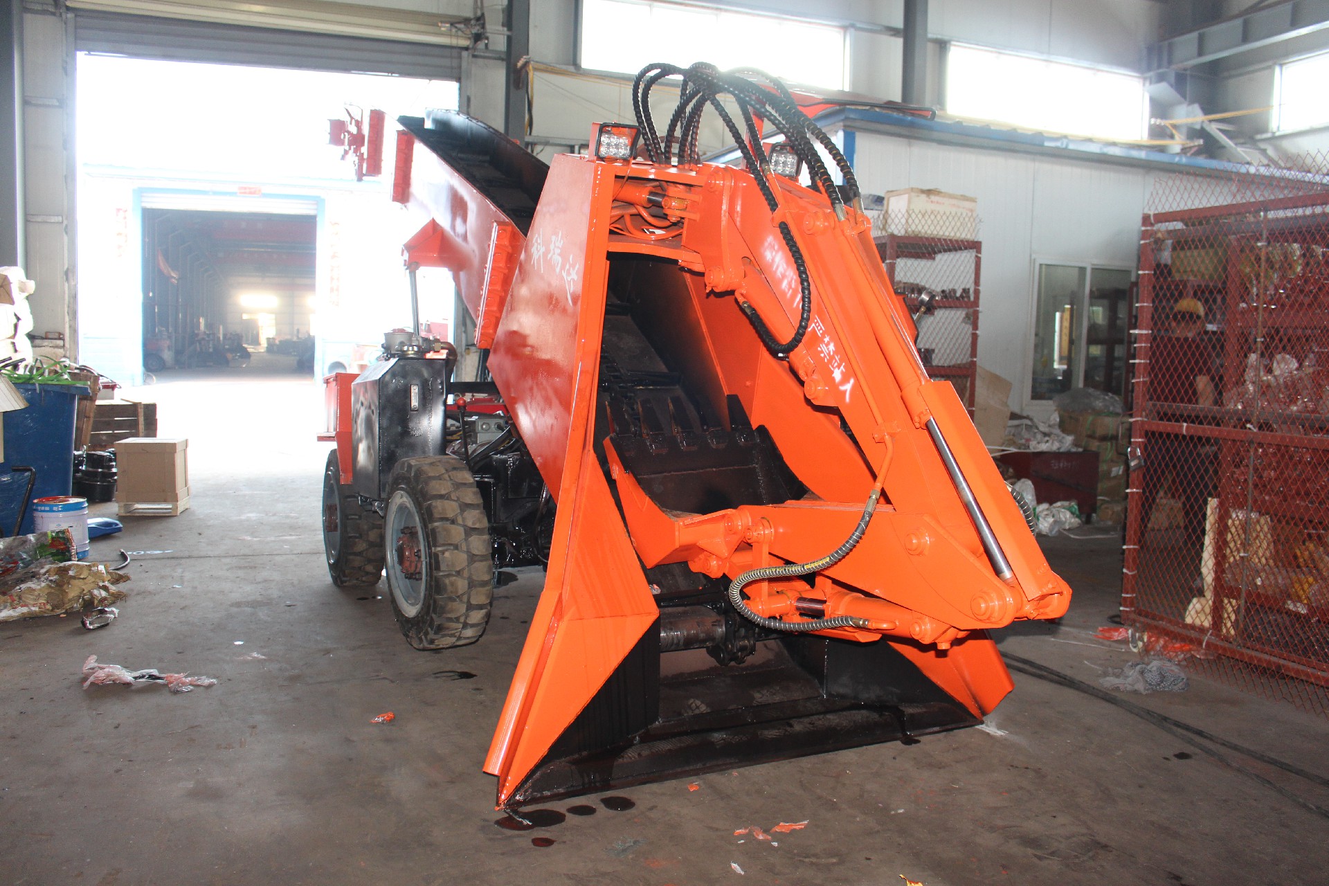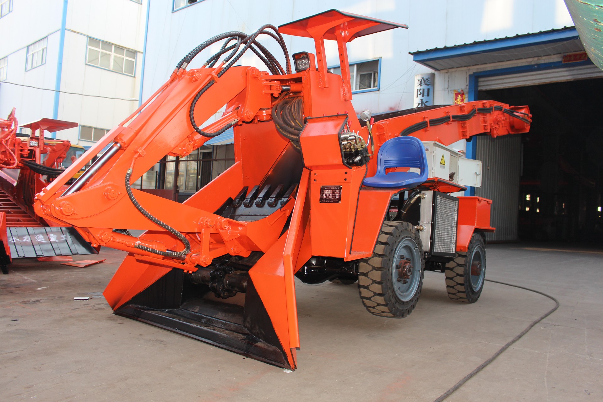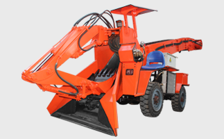 本机为四轮驱动,推动力大、扒取范围广、全断面装岩、不留死角,不需人工辅助清理工作面; 本机为链条式输送料物,完全替代皮带输送料物,使用寿命提高了30倍以上;本机采用模块式生产方便下井安装作业,车身小、结构紧凑、重心低、机动灵活、工作稳定是狭窄面不可替代的机型。