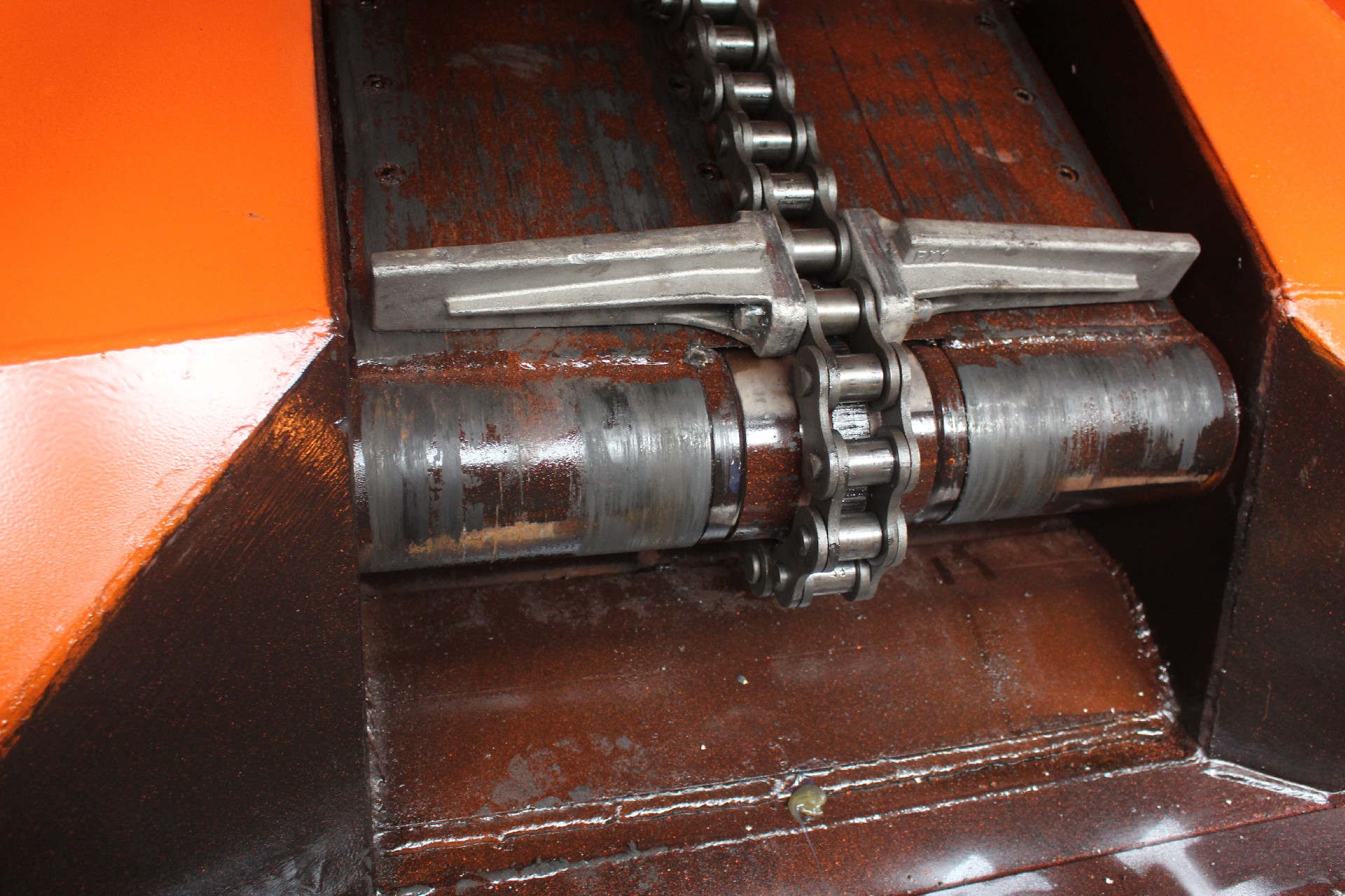 本机的工作原理是,将敞开的溜槽,作为矿料等的承受件,将刮板固定在链条上(组成刮板链),作为牵引构件。当电机传动部启动后,带动轴承上的链轮旋转,使刮板链循环运行带动物料沿着溜槽移动,直至到机头部卸载。刮板链绕过链轮作无级闭合循环运行,完成物料的输送。